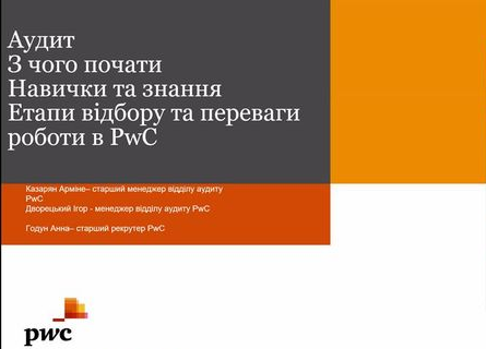 - Відкрита лекція від Price water house Coopers (PwC) за темою «Знайомство з фірмою та умовами роботи з перших вуст»