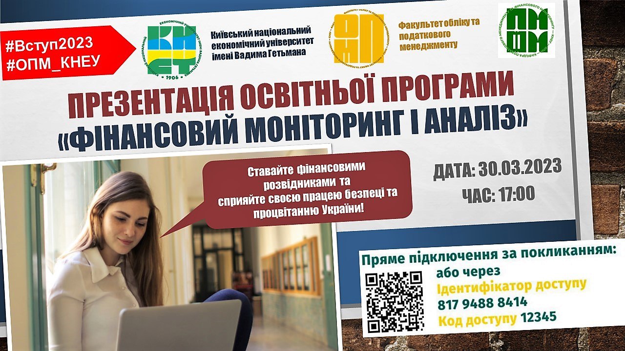 ШАНОВНІ ВИПУСКНИКИ 11-Х КЛАСІВ, ЇХ БАТЬКИ, А ТАКОЖ МАЙБУТНІ АБІТУРІЄНТИ! ПРЕЗЕНТАЦІЯ ОСВІТНЬОЇ ПРОГРАМИ.24 Березня 2023р.ШАНОВНІ ВИПУСКНИКИ 11-Х КЛАСІВ, ЇХ БАТЬКИ, А ТАКОЖ МАЙБУТНІ АБІТУРІЄНТИ!  30 березня 2023 року о 17:00 год.  Запрошуємо долучитися до знайомства з освітньою програмою для бакалаврів «Фінансовий моніторинг і аналіз» (Факультет Обліку Та Податкового Менеджменту - К Н Е У)  В ході ОНЛАЙН-зустрічі ви дізнаєтесь про:  актуальність фінансової розвідки для економічної безпеки України та протидії фінансуванню тероризму і російській агресії;  можливості та переваги навчання за ОПП «Фінансовий моніторинг і аналіз»;  думку стейкхолдерів освітньої програми (представники Міністерства фінансів України та Національного Агентства з розшуку та менеджменту активів);  особливості поєднання навчання на освітній програмі «Фінансовий моніторинг і аналіз» з отриманням професійної сертифікації АССА та СІМА;  студентське життя на факультеті обліку та податкового менеджменту КНЕУ ім. Вадима Гетьмана;  розклад профорієнтаційних занять в школі юного фінансового розвідника Участь безкоштовна! Ідентифікатор конференції: 817 9488 8414 Код доступу: 12345 До зустрічі! |