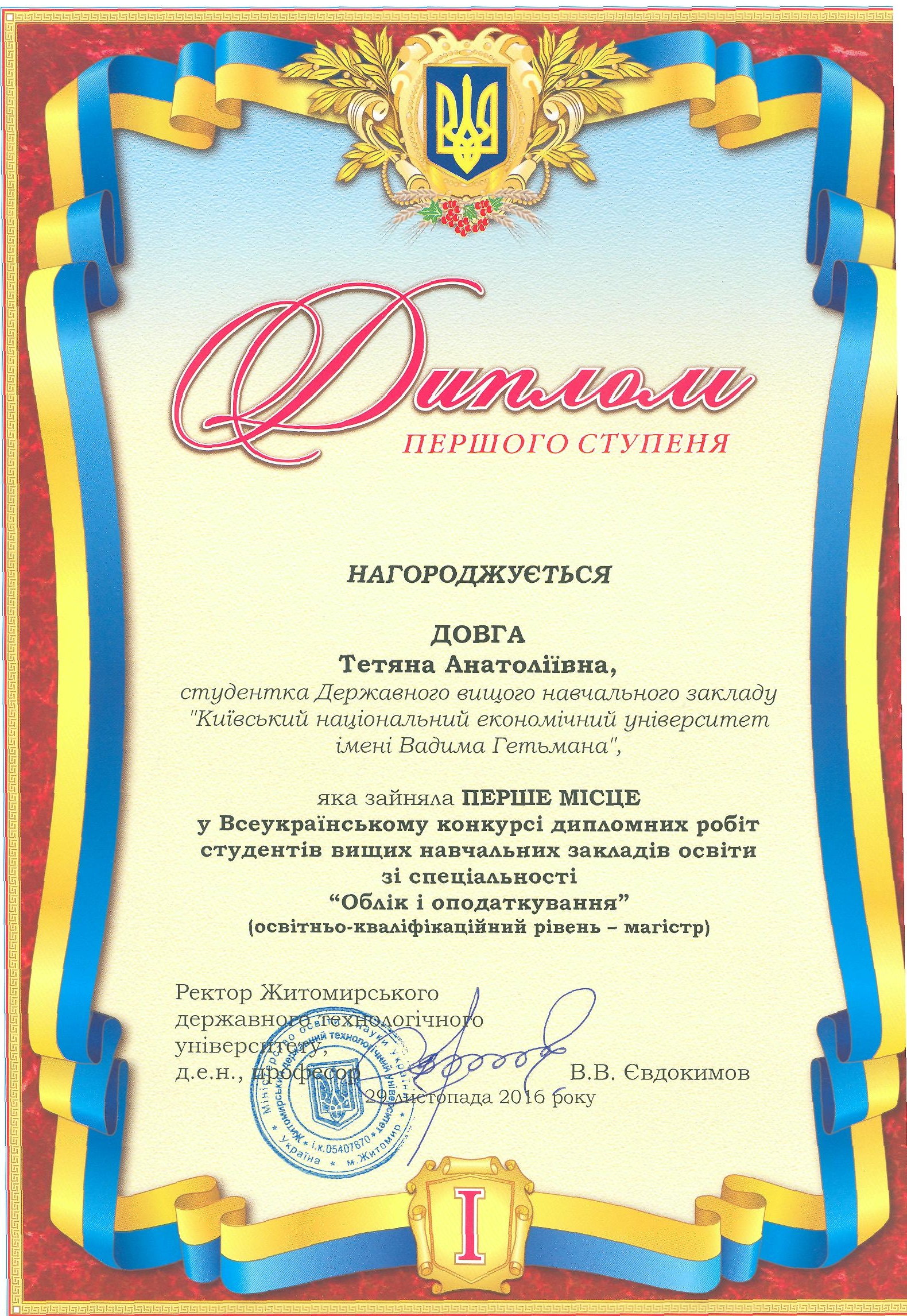 На підставі відкритого обговорення й оцінювання дипломних робіт освітньо-кваліфікаційного рівня «магістр» конкурсна комісія визнала переможцем Довгу Тетяну Анатоліївну та нагородила Дипломом І ступеня.